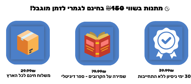 כמצוין במעמד הרכישה ובמדיניות המשלוחים שלנו, זמן עיבוד ההזמנה הוא 1-5 ימים, וזמני המשלוח הם 6-14 ימי עסקים (ימי עסקים הם הימים א׳-ה׳, לא כולל סופי שבוע וחגים).